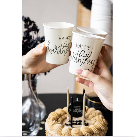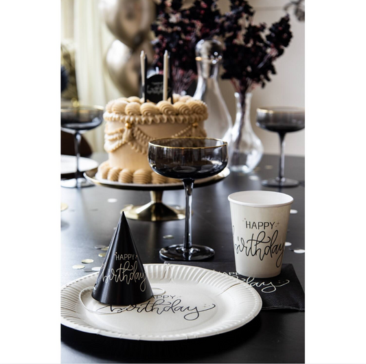 Pappadiskar - Happy birthday - Kremaður og svartur - 8 stk