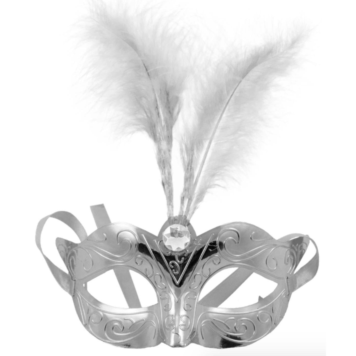 Venetian gríma, silfurlituð með fjöður.