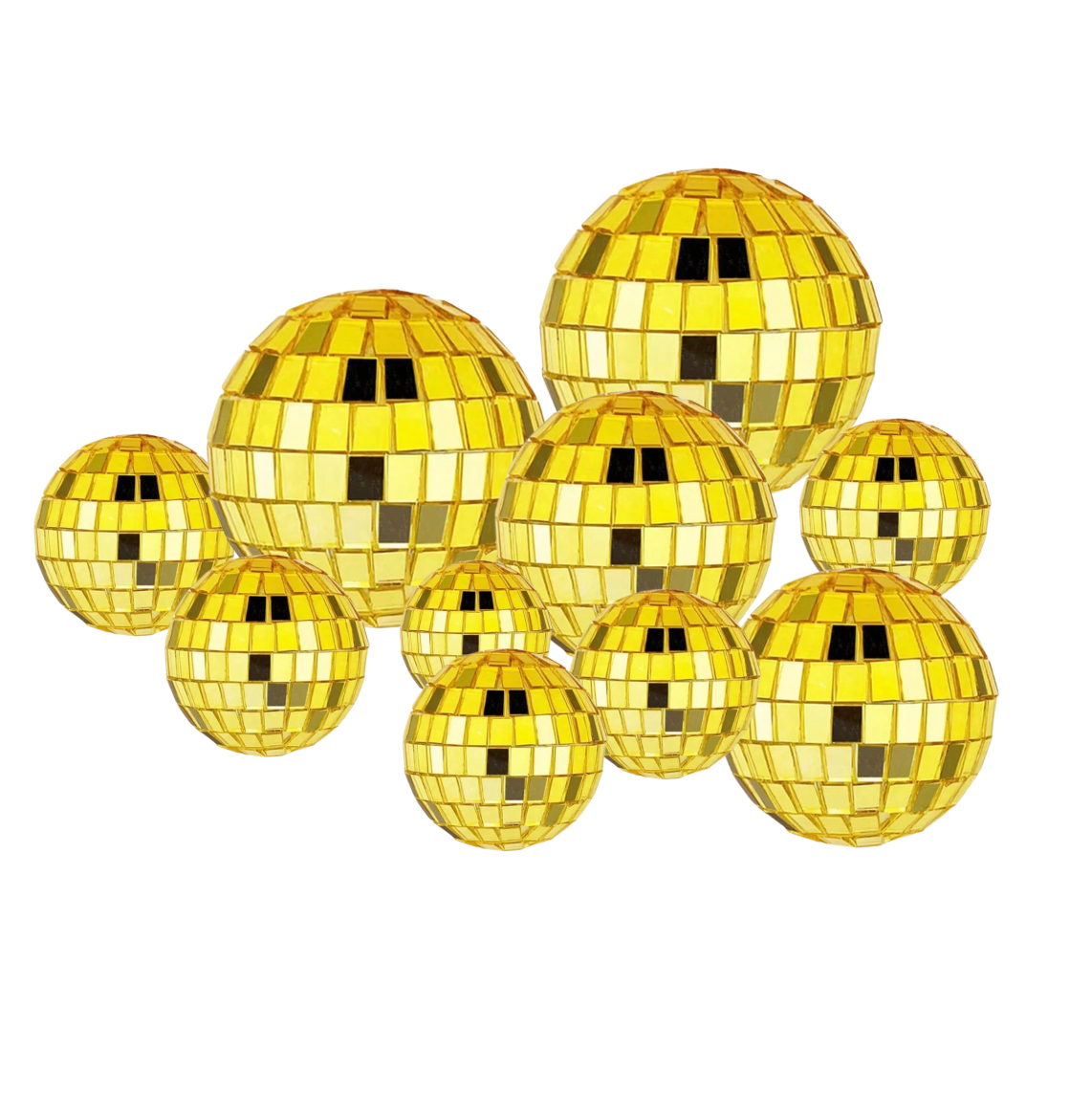 Gylltar diskókúlur í mismunandi stærð. Koma 10 stykki saman í pakka. Tilvalið sem borðskraut!