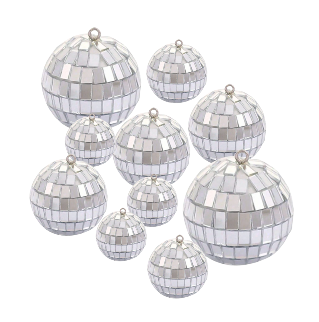 Silfurlitaðar diskókúlur í mismunandi stærð. Koma 10 stykki saman í pakka. Tilvalið sem borðskraut!