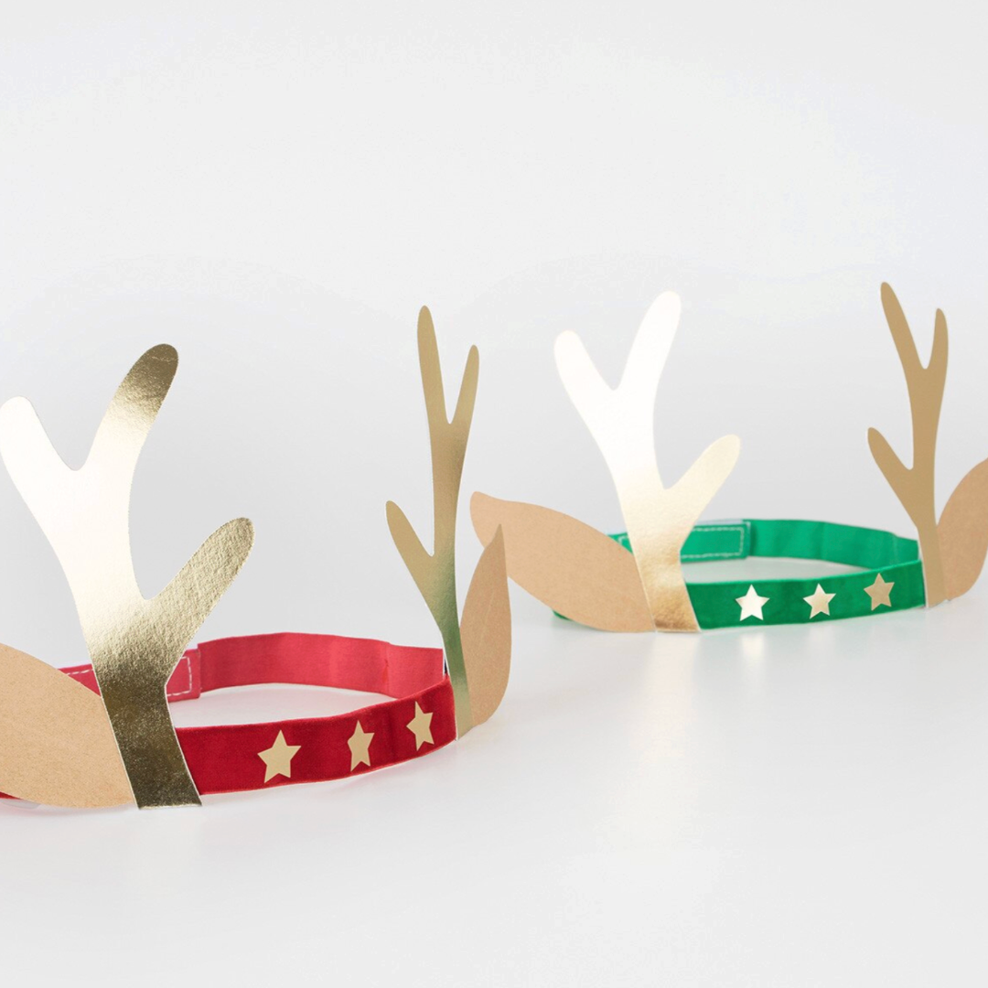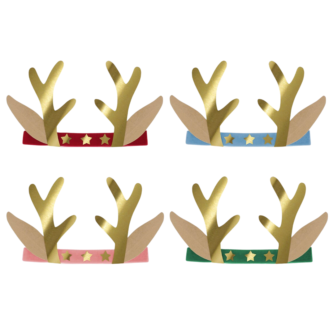 Hreindýra höfuðböndin eru úr flaueli og gylltu áli (foil). Fullkomin fyrir börn og fullorðna, 3 ára og eldri.