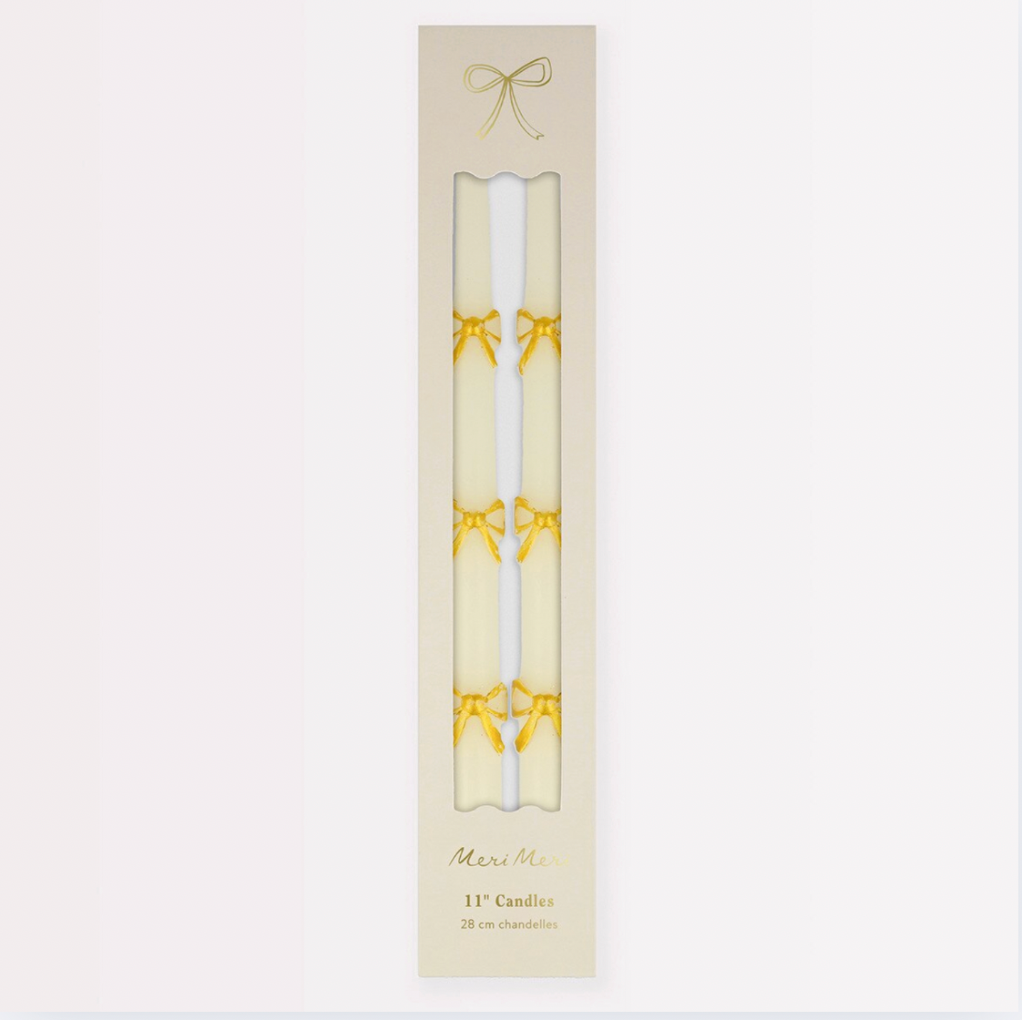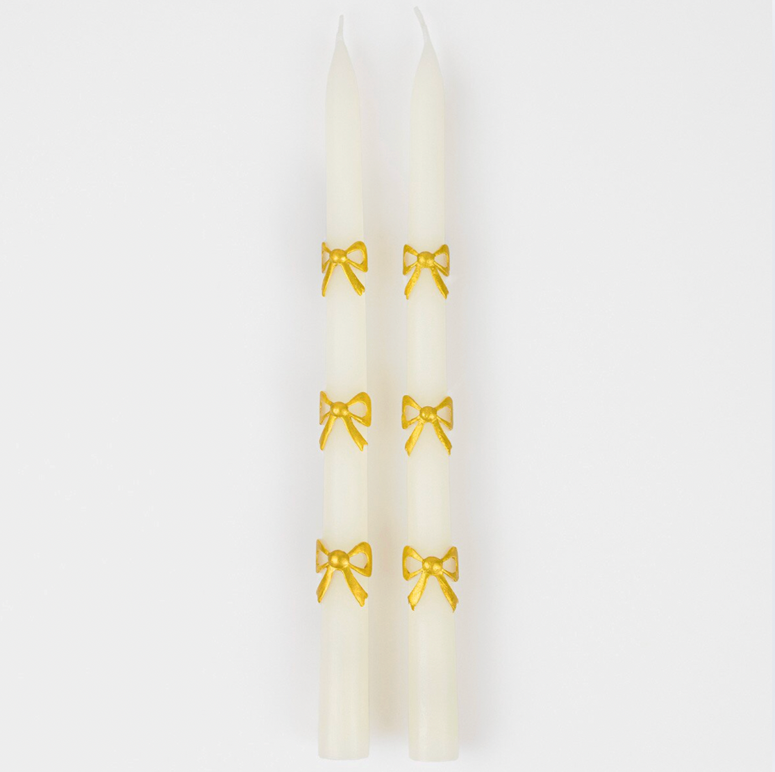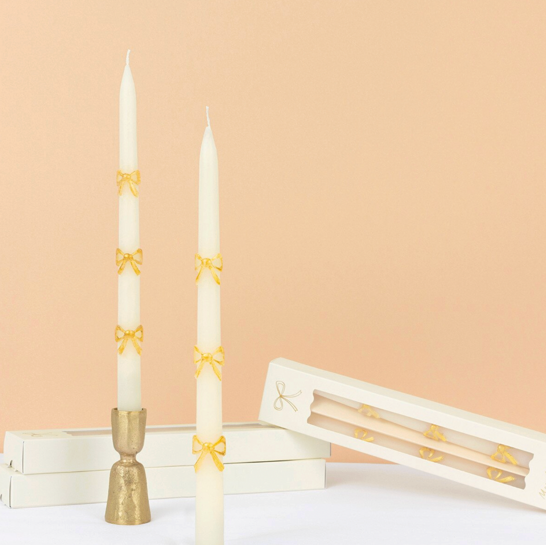 Fílabeinslituð kerti með handmáluðum slaufusmáatriðum í gylltum lit.