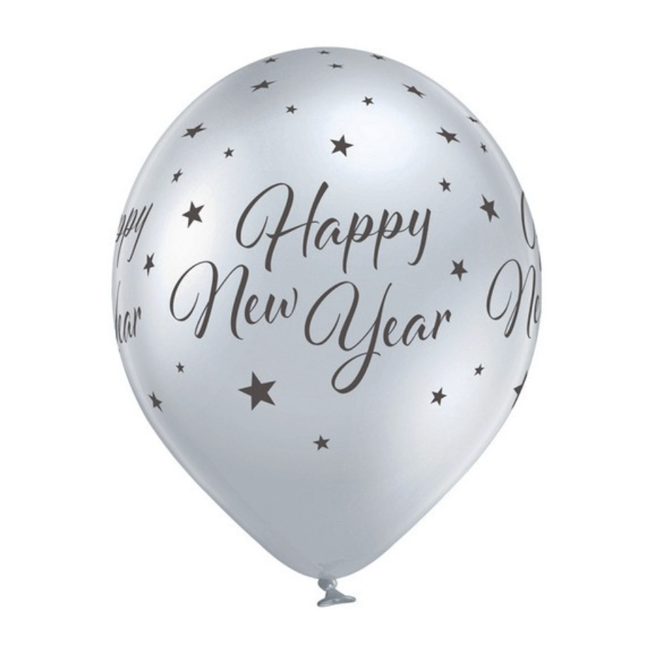 Happy new year latex blöðrur. Koma 6 stykki saman í pakka. Litir á blöðrum: gylltar og silfur litaðar með svörtum stjörnum og texta.