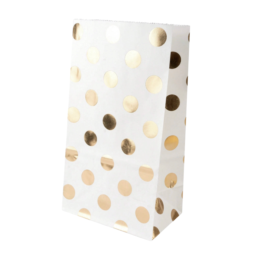 Hvítur nammipoki með gylltum doppum. Koma 12 stykki saman með pakka. 12 x brúnir hjartalímmiðar fylgja með til að loka pokanum.