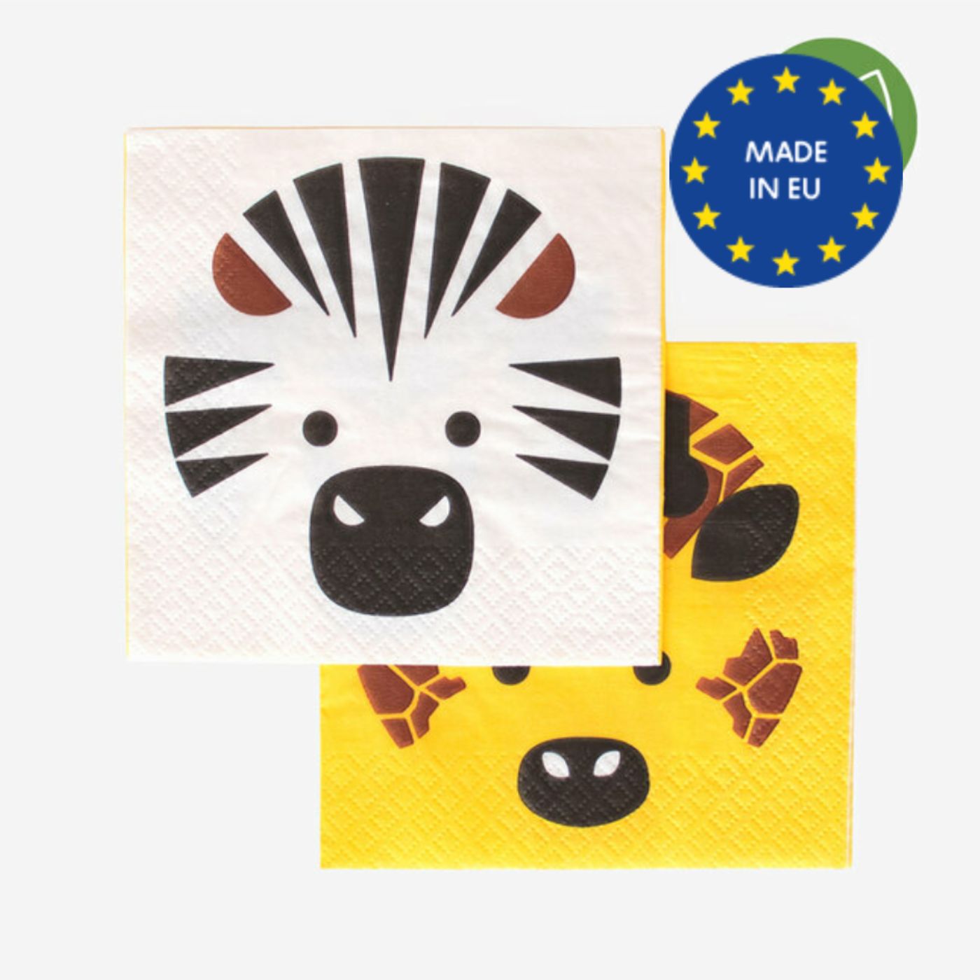 Fallegar safari dýra servíettur fyrir veisluna þína. Hver pakki inniheldur 8 stykki. Einnig eru til glös, servíettur og fleira úr sömu vörulínu. Diskarnir eru hannaðir í París og framleiddir í Evrópu úr FSC vottuðum pappír, prentaðir með jurtableki.