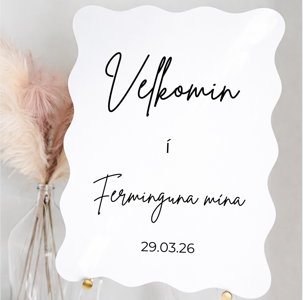Fallegt bylgju skilti með merkingu að eigin vali. Við sjáum um hönnun og útfærslu á merkingunni eftir þínu höfði. Fullkomið fyrir tilefnið hvort sem það er stórt eða smátt. Til dæmis fyrir brúðkaupið, útskriftina, babyshower, skírn eða einfaldlega gott partý.